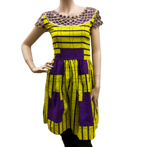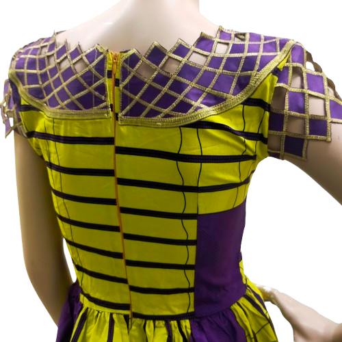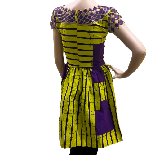 Deze vrolijke geel-paarse jurk is een perfecte keuze voor een zomerse dag. De jurk is voorzien van een rits aan de achterzijde voor een optimale pasvorm.