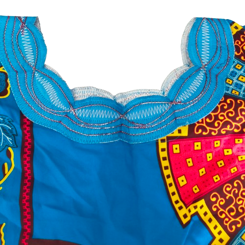 Deze lange blauwe jurk in Afrikaanse stijl is zowel elegant als praktisch. De jurk is voorzien van een rits en een handige zak.