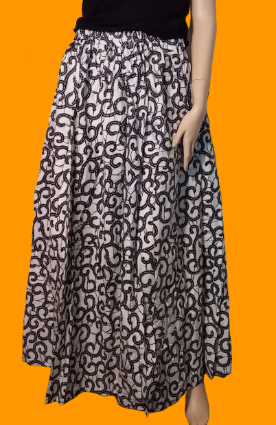 Prachtige maxi rok met een wit Ankara design. Deze rok is voorzien van een 2 cm elastische band en twee handige zakken.